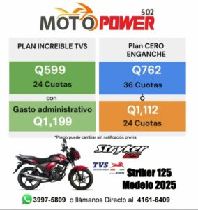 Moto Amigo, como ejemplo aqui te mostramos 3 de los planes de financiamiento  a los que podrías calificar si llenas todos los requisitos de papeleria que te pediria la fianciera.  En este caso,  en el plan Increible de TVS  podrías llevarte tu moto poniendo Q1,199 de gasto administrativo y pagando 24 cuotas mensuales de Q599